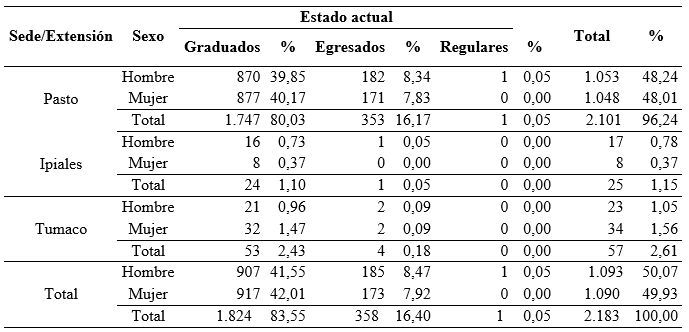 Para la determinación de la muestra estadística se analizaron algunos registros históricos de las antiguas Oficinas de Planeación y Registro Académico de la Universidad de Nariño y una base de datos de los egresados del Programa de Economía con corte a 9 de febrero de 2021 proporcionada por el Centro de Informática de la Universidad de Nariño. En los archivos históricos se reportan 128 egresados (76 egresados sin título y 52 graduados) en el periodo 1973-II-1982-I. El total de egresados del Programa de Economía con corte a 2020-II es de 2.183, con el 96,24% egresados de la sede Pasto, 1,15% de la Extensión de Ipiales y 2,61% de la Extensión de Tumaco. Del total de egresados el 50,07% corresponde a hombres y 49,93% a mujeres, reportándose 1.824 (83,6%) economistas graduados. Los diez primeros economistas graduados (6 mujeres y 4 hombres) se registran en el periodo 1979-I, con una tasa de graduación del 50% (de los 59 matriculados en 1973-II, 20 egresaron en 1979-I y 10 se graduaron en el mismo periodo, como parte de la primera promoción, como se indica en la Tabla 3.