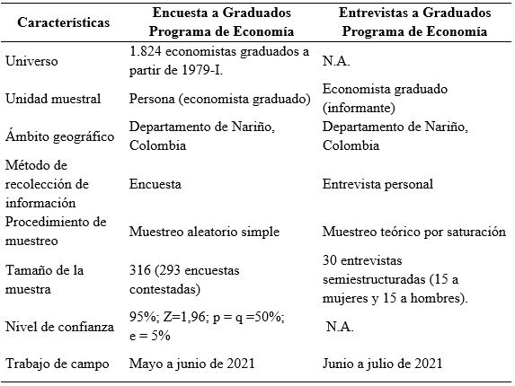 Esta investigación tomó como marco muestral a los 1.824 economistas titulados en el periodo comprendido entre 1979-I y 2020-II. A partir de este universo, se calculó una muestra estadística de 316 personas para la aplicación de un cuestionario en línea de indagación de condiciones ocupacionales. El diseño metodológico se apoyó en dos instrumentos básicos de recolección y análisis de información primaria, a saber: una encuesta de corte cuantitativo y una entrevista individual semiestructurada de carácter cualitativo. El cuestionario se aplicó entre mayo y junio de 2021, aunque esta encuesta fue enviada a los 734 contactos disponibles en la base de datos arriba mencionada, también se utilizó el método de bola de nieve (un graduado busca a otro graduado) para contactar a más personas. A través de mensajes por correo electrónico y llamadas telefónicas, se logró que 294 economistas graduados contestaran la encuesta; una encuesta fue respondida de modo incompleto, la cual fue desechada posteriormente, para un total de 293 cuestionarios válidos. Guba & Lincoln (2002) aseveran que en el paradigma epistemológico constructivista e interpretativista, la naturaleza variable y personal (intramental) de las construcciones sociales sugiere que las construcciones individuales pueden ser producidas y refinadas sólo mediante la interacción entre el investigador y quienes responden, dichas construcciones se interpretan utilizando técnicas hermenéuticas convencionales y se contrastan mediante un intercambio dialéctico (pág. 128). Para ampliar la comprensión del objeto de estudio y acudiendo a las técnicas de investigación cualitativa, se aplicaron 30 entrevistas virtuales a economistas de diferentes cohortes, con una duración promedio de una hora por entrevista, efectuadas en horarios diurno y nocturno, de conformidad con la disponibilidad de tiempo de los entrevistados; este proceso se surtió entre los meses de junio y julio de 2021 (véase Tabla 4).