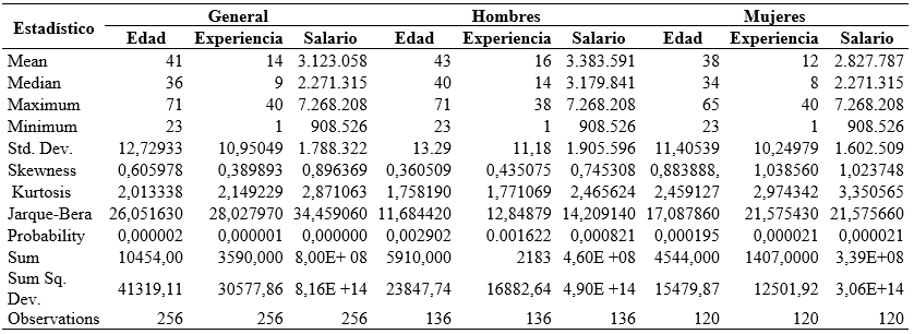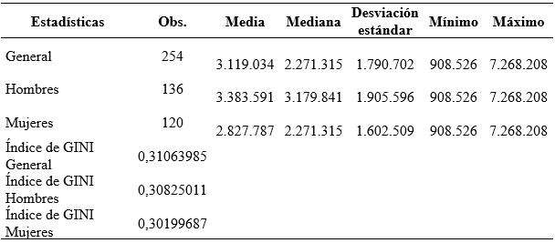 Estadísticas descriptivas del salario e índice de desigualdad de GINI