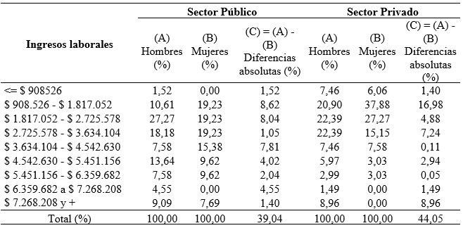 El análisis de la discriminación salarial de las mujeres con respecto a los hombres se soporta en la construcción de un índice de segregación como el sugerido por McConnell & Brue ( 1997), aplicado este, a los sectores público y privado. En la Tabla 7, en general, se aprecia que las diferencias salariales son mínimas; en particular, en el sector público; observándose una diferencia en el rango de ingresos entre 1 y 2 smmlv, a favor de los hombres, siendo más pronunciada en el sector privado. El índice de segregación es de 19,52% en el sector público y de 22,03% en el sector privado, con un mayor valor en los ingresos que oscilan entre 1 y 2 smmlv; situándose los hombres, en una posición salarial más favorable.