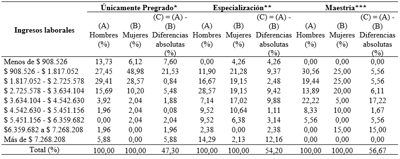 Una proporción significativa de mujeres (48,98%) en posesión del título de pregrado únicamente, perciben ingresos entre 1 y 2 salarios mínimos con una diferencia de 21,53% en su contra. El 17,02% de las mujeres con título de maestría reciben entre 4 y 5 salarios mínimos con una diferencia de 9,88% a favor de las mujeres; el 22,22% de los hombres con maestría reciben entre 4 y 5 salarios con una diferencia de 17,22% a favor de los hombres. En general, existe una mayor concentración de los ingresos laborales a nivel de maestría de 28,3% a favor de los hombres, 27,1% a nivel de especialización y 23,6% a nivel de pregrado a favor de los hombres. No se tomó la formación a nivel de doctorado, puesto que los casos son muy reducidos (véase Tabla 8).