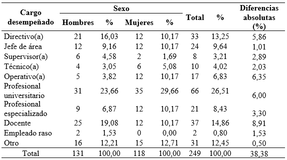 Esta investigación también indagó sobre el nivel de desempleo por sexo a través de la pregunta: ¿en qué ocupó usted la mayor parte del tiempo en la semana pasada? Las diferencias entre las tasas de desempleo entre hombres y mujeres son mínimas, 3,41% en hombres y 3,07% en mujeres para un total de 6,48%. Considerando que la actual situación de pandemia ha socavado el trabajo a nivel mundial, la medición de la tasa de paro en la presente investigación también se verificó a través de la pregunta relacionada con el cargo que el encuestado ocupa actualmente. El 13,0% de los economistas afirman estar desempleados (12,9% en hombres y 13,0% en mujeres), lo cual ratifica que la carga del desempleo está perfectamente balanceada entre mujeres y hombres.