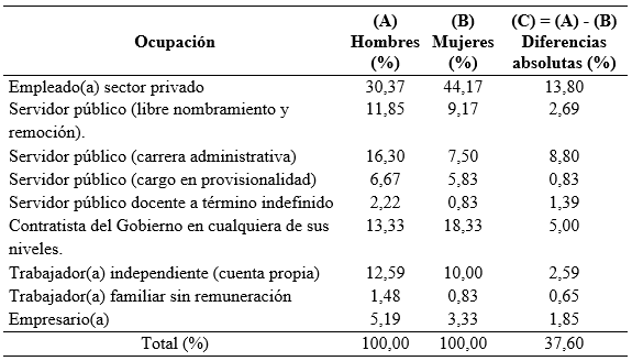 Las distribuciones ocupacionales de los hombres y de las mujeres se muestran en las columnas 2 y 3 de la Tabla 10. Para que sea idéntica la distribución por ocupación laboral, el 18,80% de las mujeres tendrían que cambiar de ocupación para que ambos sexos estuvieran distribuidos en las mismas proporciones entre las ocupaciones. Se observa una diferencia de 13,80% en la ocupación de empleado del sector privado a favor de las mujeres, de servidor público de carrera administrativa de 8,80% a favor de los hombres y de 5,0% en el cargo de contratista del gobierno a favor de las mujeres.