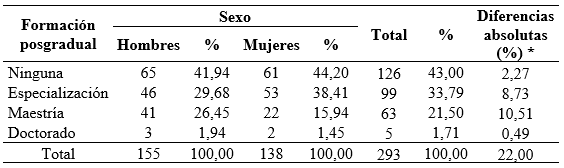 La discriminación en la acumulación de capital humano se da cuando las mujeres tienen menos acceso a las oportunidades que incrementan la productividad laboral a partir de la formación y la capacitación para el trabajo y el desarrollo humano, teniendo en cuenta que la educación potencia ostensiblemente el desarrollo de capacidades, la ampliación de la libertad y la realización personal. El 43,0% (41,94% de hombres y 44,20% de mujeres) de los economistas manifiestan no contar con ninguna formación posgradual, el 33,79% alcanzaron formación en especialización a favor de las mujeres, el 21,50% tienen formación a nivel de maestría a favor de los hombres y una proporción muy pequeña cuenta con estudios de doctorado (1,71%) en una proporción balanceada (véase Tabla 11).