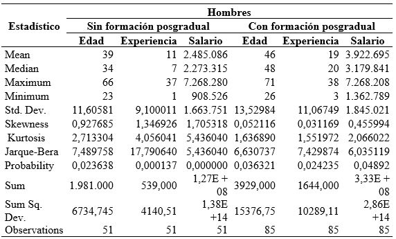 La brecha salarial de género es mínima, tal solo de 0,76% de diferencia salarial por cada año de experiencia profesional en contra de las mujeres. Por cada año de experiencia profesional de las mujeres, su salario se reduce en 0,76% en comparación la renta laboral de los hombres. La formación posgradual en maestría, incrementa el salario de las mujeres en 32,81% en comparación con los hombres y por cada año de experiencia profesional en hombres y mujeres, el salario aumenta en 4,62%. La edad tiene un efecto negativo en ambos sexos; por cada año adicional de edad, el salario se reduce en 1,68% como efecto de las preferencias de los empresarios por contratar personas más jóvenes.
