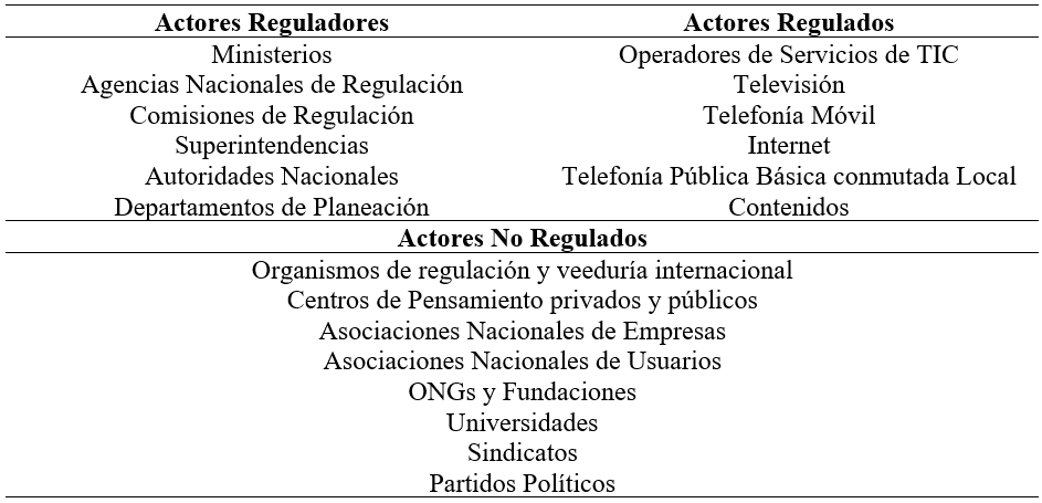 En Colombia las instituciones que finalmente consolidan e implementa, la política pública de regulación de las TIC, entre el periodo 2009-2020, son principalmente: El MinTIC, la Superintendencia de Industria y Comercio (SIC), la Agencia Nacional del Espectro (ANE), la Agencia Nacional de Televisión (ANTV), la Comisión de Regulación de Comunicaciones (CRC) y el Departamento Nacional de Planeación (DNP) .