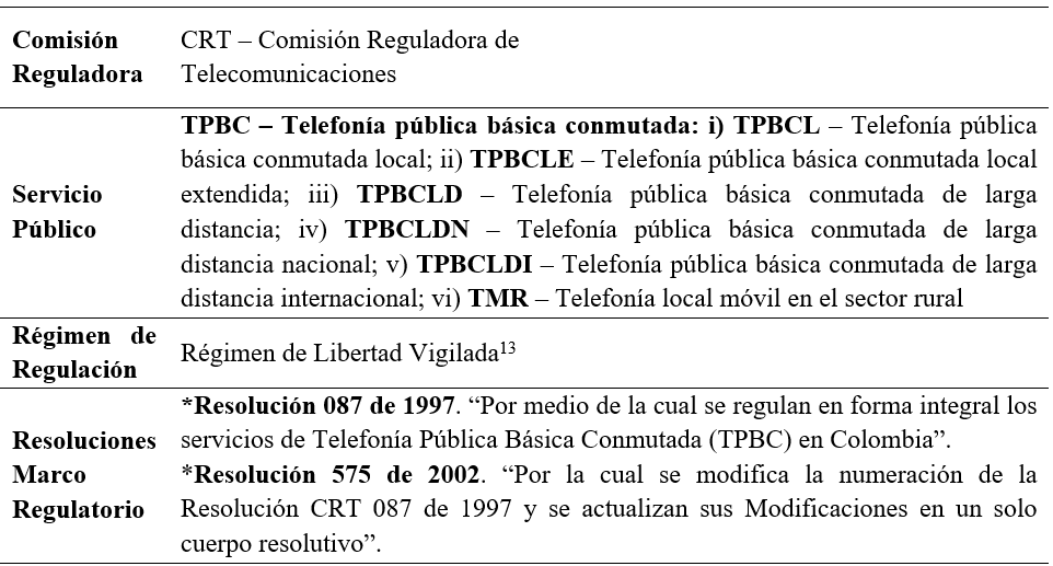 El marco regulatorio de las telecomunicaciones en Colombia entre los años 1991-2009, aplicaba el régimen tarifario de la siguiente forma (ASOCEL, 2004, Cortés, 2012; CINTEL, 2006, 2007, 2013; CRC, 2010; CRT, 2010; Fedesarrollo, 2011; Montenegro y Niño, 2001; Tabarquino, 2011; Tabarquino, 2018; Uribe, 2005):