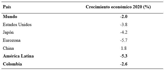 Una de las variables que permite aproximarse a la magnitud de la crisis es la tasa de crecimiento del Producto Interno Bruto (PIB) mundial, de acuerdo con la Comisión Económica para América Latina y el Caribe (CEPAL, 2020), el PIB mundial va a crecer cerca de un -2%, la caída más fuerte en la producción global desde 1929; siendo mayor el choque en los países desarrollados que en los países emergentes, mientras China, a pesar de esperar una tasa de crecimiento positiva, será mucho menor a la pronosticada a inicio de año (Ver Tabla 1). El crecimiento negativo que se observa en la tabla mencionada tiene varios determinantes, tanto del lado de la oferta como de la demanda. En primer lugar, las cadenas de abastecimiento y logísticas de las empresas en el mundo han sido interrumpidas debido a las medidas adoptadas para reducir la velocidad de propagación del virus de la COVID-19. Adicionalmente, la política de confinamiento implementada en gran parte del mundo impide que muchos trabajadores puedan asistir de forma normal a sus lugares de trabajo, interrumpiendo así el normal funcionamiento de las firmas. Así mismo, el confinamiento ha provocado que el consumo de los hogares se reduzca considerablemente o en el mejor de los casos se concentre en bienes de primera necesidad (CEPAL, 2020).
