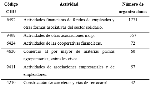 Con el fin de identificar el sector donde se encuentran, se realizó una revisión del Código Industrial Internacional Uniforme – CIIU, el cual es la clasificación internacional de todas las actividades económicas que puede desarrollar una empresa. Se encontró que las cinco actividades más representativas son las actividades financieras, el comercio al por mayor de materias primas agropecuarias y la construcción (Tabla 4).