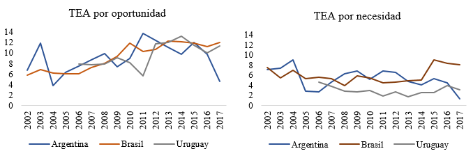 En el caso de Uruguay, sólo se hallaron datos sobre la TEA (por oportunidad y por necesidad) a partir del año 2006.