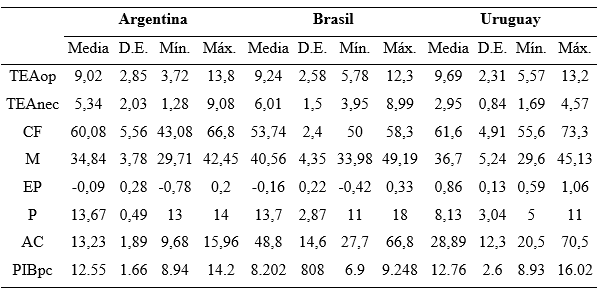 La Tabla 2 presenta algunos estadísticos descriptivos de las variables para los países del bloque analizado. Se puede observar que Uruguay evidenció el comportamiento más estable, reflejado en el desvío estándar de este indicador. Respecto de la TEA por necesidad, Brasil tuvo el promedio más alto durante el período y Uruguay, el más bajo. Por su parte, Argentina registró tanto el valor máximo (9,08) como el mínimo (1,28) de todo el bloque, reflejando, de este modo, un comportamiento más inestable para esta variable.