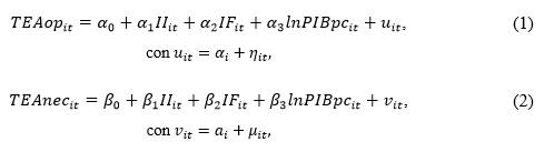 Se estimaron dos ecuaciones, que analizan los efectos de las instituciones en la TEA por oportunidad (como muestra la Ecuación 1) y en la TEA por necesidad (presentado en la Ecuación 2):