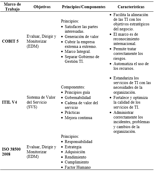 Es considerado como un conjunto de buenas prácticas que sirve para apoyar a las organizaciones en temas de GTI (Yrigoyen, 2016). Entre los marcos de gobernabilidad más reconocidos a nivel internacional para la generación de valor en las empresas, se encuentran la Organización Internacional de Normalización (ISO/IEC 38500), Biblioteca de Infraestructura de Tecnologías de la Información (ITIL) y Objetivos de Control para la Información y Tecnologías Relacionadas (COBIT).