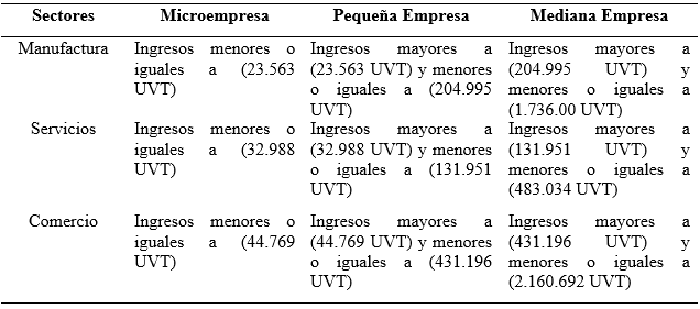 De acuerdo al Decreto 957 del 2019 de Colombia, las PYMES se clasifican a partir de los ingresos por actividades ordinarías anuales en Unidades de Valor Tributario (UVT) en los sectores de manufactura, servicios y comercio (Orozco et al., 2019). A continuación, se presenta en la Tabla 2 la clasificación de las PYMES por cada sector y tipo de empresa.