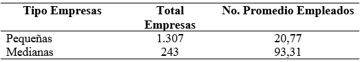 De acuerdo con la base de datos proporcionada por la empresa COMFAMILIAR, a fecha del año 2020, se presenta en la Tabla 3 la población objetivo del proyecto de investigación, conformada por el total de PYMES y número promedio de empleados por cada tipo de empresa de la ciudad de Neiva, afiliadas a la organización. Las pequeñas empresas tienen en total 1307 afiliaciones y un número promedio de empleados de 20,77. Las medianas empresas cuentan con un total de 243 afiliaciones y un número promedio de 93,31 empleados.
