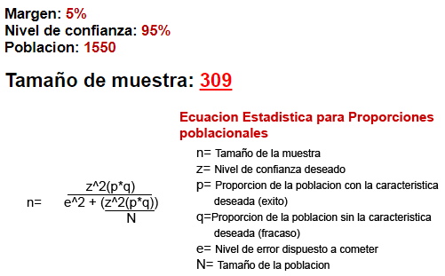 Identificada la población objetivo, se selecciona la muestra del caso de estudio, de acuerdo con las siguientes consideraciones representadas en la Figura 1: margen de error; constituido por el 5%; nivel de confianza con 99%; tamaño de población, con 1550 PYMES. Cada una de estas consideraciones permitió determinar de manera confiable la muestra de la población final del proyecto, con un total de 309 PYMES.