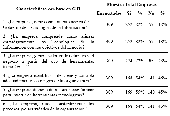 La Tabla 4, presenta los resultados de la encuesta de reconocimiento de GTI, aplicada a las PYMES de la ciudad de Neiva, afiliadas a COMFAMILIAR Huila. El análisis principal destaca en la pregunta 1, que 252 de 309 empresas equivalente a un 82%, tienen conocimiento en temas relacionados con GTI, generando viabilidad de acercamiento a la población de PYMES. Sin embargo, a pesar del buen nivel de porcentaje de reconocimiento de GTI, la encuesta revela las siguientes consideraciones adicionales: la pregunta 4 demuestra que 141 de 309 PYMES equivalente a un 46% del total de la muestra, no gestionan apropiadamente los riesgos de la organización, un factor importante que permite contrarrestar las continuas amenazas que se presentan en una organización; la pregunta 5 denota que 140 de 309 PYMES equivalente a un 45% total de la muestra, afirmaron no contar con recursos económicos para invertir en estrategias que incluyan herramientas tecnológicas, lo que dificulta el alineamiento estratégico y la generación de valor en las PYMES; la pregunta 6 manifiesta que 141 de 309 PYMES equivalente a un 46% total de la muestra, no miden los procesos y/o actividades de la organización, generando dificultad en identificar y establecer aspectos como la exactitud de lo que se hace en la empresa, las áreas que se deben fortalecer, debilidades del negocio y soluciones futuras bien definidas para un mejoramiento continuo.