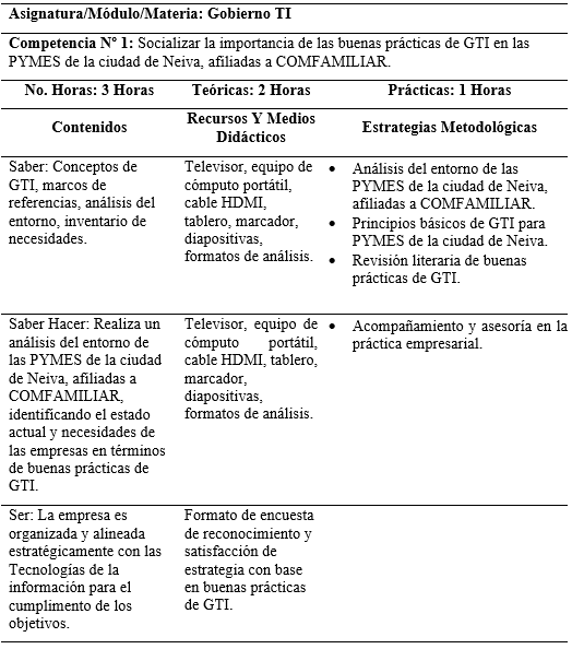 Se conforma por un proceso de formación de enseñanza y aprendizaje de forma virtual para contextualizar la estrategia con base en buenas prácticas de GTI en las PYMES de la ciudad de Neiva, afiliadas a COMFAMILIAR. La capacitación busca mejorar las competencias y habilidades de empresarios para aumentar la competitividad y sostenibilidad de los negocios en mercados altamente competitivos.