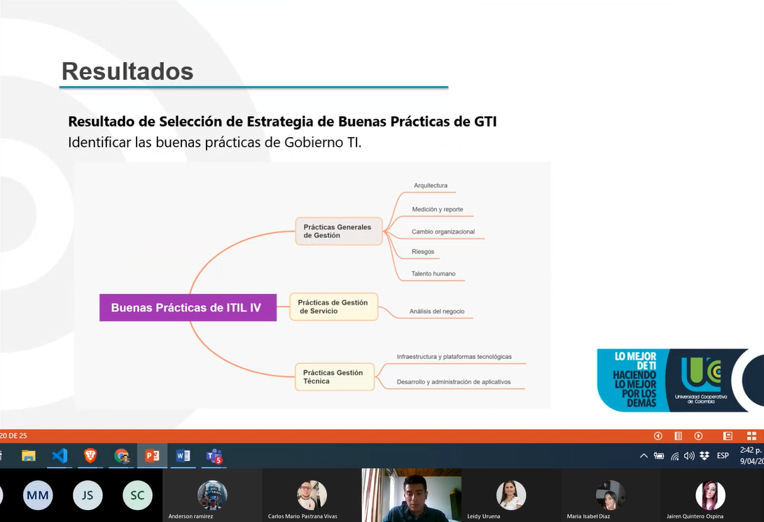 En el diseño de la planeación estratégica de orientación de buenas prácticas de GTI, se realizó un análisis de los marcos de referencias como COBIT, ITIL, ISO 38500, que ayudan alinear correctamente las TI y objetivos de negocio para la generación de valor en las PYMES. La formación de la estrategia de GTI permitió realizar un primer acercamiento con las PYMES de la ciudad de Neiva, afiliadas a COMFAMILIAR, destacando el claro interés de los empresarios en adoptar buenas prácticas para aumentar la competitividad y sostenibilidad de las empresas. Los empresarios reconocen la intervención social de COMFAMILIAR y manifiestan estar interesados en continuar realizando procesos de formación en temas relacionado con GTI para fortalecer las competencias y habilidades.