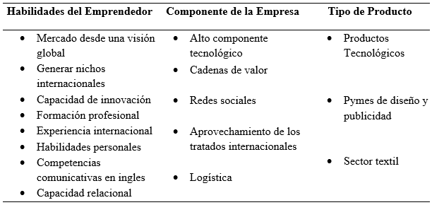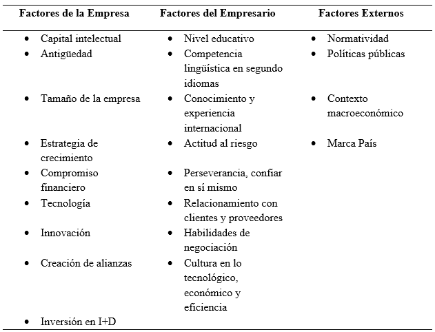 Como se puede observar, estos factores se convierten en los principales determinantes de acuerdo con la literatura y buscan garantizar el éxito para una Born Global con innovación empresarial. La clasificación no solo corresponde a los factores del empresario como agente propulsor de este tipo de emprendimientos, sino también factores externos que van desde políticas gubernamentales que propendan en la creación de nuevas empresas hasta la reputación del país junto con el manejo de sus indicadores macroeconómicos; sin desconocer los factores internos que contemplan el relacionamiento empresarial y las estrategias para enfrentar el cambio como la innovación, alianzas estratégicas, compromiso financiero, entre otras.