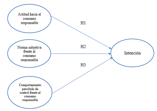 Es así como un estudio del fomento al consumo responsable debería involucrar acciones y prácticas puntuales para que las personas puedan realizar y sientan que aportan en la solución de los problemas (Sierra et al., 2016). Para que, de esta forma, la conducta individual se sume al colectivo y se convierta en un polo transformador de realidades que tiene como un objetivo clave ofrecer un camino hacia el desarrollo sostenible. Por tanto, se hace necesario revisar el grado de compromiso frente al consumo responsable, por medio de la TCP, en tanto que permite un abordaje integral para identificar las actitudes de la persona, los estímulos y presiones sociales, así como la percepción de control que impactan en la voluntad del individuo para actuar hacia un desarrollo sostenible. En la Figura 1 se observa el modelo propuesto a partir de la TCP y se plantean las siguientes hipótesis: