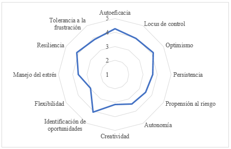 Autoeficacia, locus de control, optimismo, persistencia, propensión al riesgo, autonomía, creatividad, identificación de oportunidades, flexibilidad, manejo del estrés, resiliencia y tolerancia a la frustración |