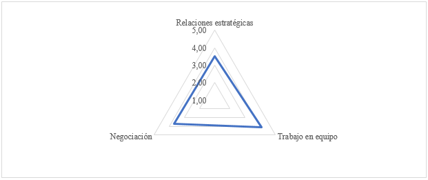 Frente a la dimensión de negociación (3,69), esta presenta oportunidades de mejora con el fin de progresar y aprovechar el trabajo colaborativo, para buscar relaciones con acuerdos satisfactorios para las partes. Por esta razón, se hace oportuno buscar procesos de comunicación que posibiliten establecer acuerdos de cooperación y de beneficio mutuo. Mientras que la dimensión de relaciones estratégicas (3,53) se identifica como la gran debilidad del componente, debido, a que aun cuando se busca una colaboración para realizar proyectos, esta relación no es estratégica, lo que no permite un crecimiento para los aliados que deciden colaborar, así, aún cuando los estudiantes desarrollan relaciones de contacto, estas tienen la oportunidad de ser más relevantes y complementarias.
