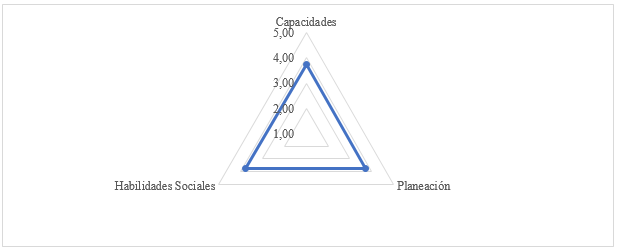 Finalmente, se obtuvo la puntuación global, la cual partió de un estudio transversal de los promedios de los tres componentes, capacidades personales (3,74), planeación (3,73) y habilidades sociales (3,77). Este análisis permitió identificar un perfil promedio del estudiante Cunista respecto a su intención y actitud emprendedora. Se encontró que, aun cuando los tres componentes presentan un comportamiento similar, predomina la Planeación junto a las Habilidades Sociales, como se muestra en la Figura 4; lo que significa que los estudiantes tienen una orientación hacia el logro y a la generación de relaciones que les permite cumplir sus objetivos por medio del trabajo en equipo y la creación de redes de contacto. Por este motivo, asumen una aproximación y un favorecimiento para involucrarse en retos colaborativos que les permitan demostrar sus capacidades, como la creación de empresas. Sin embargo, al estar aún en etapa de formación, hay un campo de mejora de sus competencias.