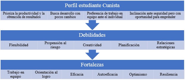 Por consiguiente, el perfil del estudiante Cunista se muestra en la Figura 5. Las actitudes analizadas evidencian una posibilidad de creación de empresa por parte de los estudiantes. Se destacan las fortalezas alrededor de la productividad y en énfasis en los resultados, mientras que los aspectos por mejorar están la flexibilidad, la creatividad y la planificación.