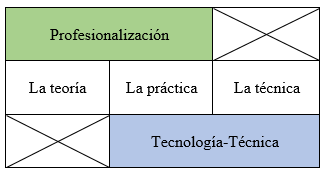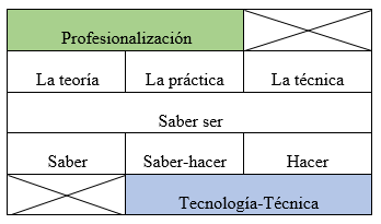 Dado lo anterior, se propone para la comprensión de este trabajo, analizar el grado de prevalencia en las competencias profesionales, tecnológicas y técnicas, caracterizadas en cuatro pilares: el saber ser, el saber, el saber-hacer y el hacer. La profesionalización debe alimentar el desarrollo de competencias sobre el saber y el saber-hacer, donde exista relación entre el conocimiento teórico y práctico. Las áreas tecnológicas deben alimentar una competencia del saber-hacer hacia el hacer.