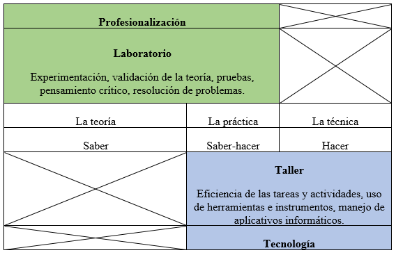 No obstante, el laboratorio y taller, tienen tendencias muy marcadas que los hacen diferentes. Como se puede observar en la Figura 3, en el taller prevalece la práctica con tendencia más a un aprender-hacer, que al saber. En cambio, en el laboratorio predomina más el saber, que el hacer, siendo una práctica marcada por la teoría.