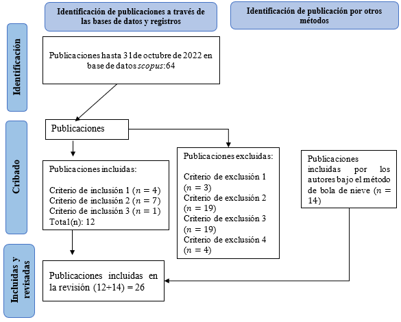 Teniendo en cuenta que el número de artículos, una vez aplicados los criterios de inclusión y exclusión, fue reducido, se consideró necesario adicionar 14 documentos relacionados con las preguntas de investigación, que los autores de la presente investigación conocían, para así complementar los puntos de análisis propuestos desde las dos preguntas de investigación que orientaron el estudio. Los documentos incluidos son aquellos que se relacionan en las Tablas 2 y 3, y se adicionaron siguiendo el método de bola de nieve (Wohlin, 2014). Considerando los documentos adicionados se consolidó un total de 26 artículos, los cuales fueron los que al final se revisaron a profundidad.