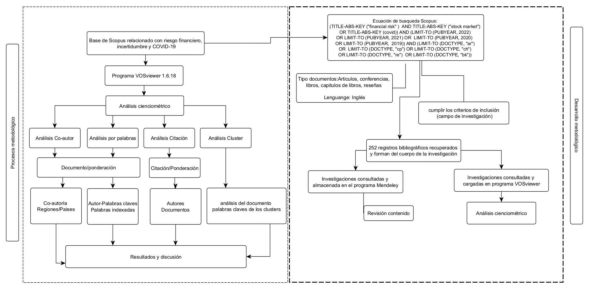 Así, el proceso de investigación partió de la búsqueda de la base de datos de Scopus, teniendo en cuenta que congrega una amplia variedad de revistas a nivel mundial (Duque y Cervantes, 2019); sin embargo, es necesario aclarar la existencia de sesgos de publicación atribuidos a la responsabilidad de autores, sistemas editoriales y revistas, que ocasiona que en muchos casos los estudios se conviertan en datos de sobremesa, motivando a investigadores a remitirse a fuentes de poca calidad científica como resúmenes de conferencia, tal como lo describe Baladia y Martínez (2015). Bajo ese contexto, para la incorporación de documentos (artículos, capítulos de libros, libro, documentos de conferencia y reseñas) se consideró que estos fueran escritos en inglés durante el periodo 2019 a 2022 y que los criterios “riesgo financiero”, “mercados bursátiles” y “COVID”, se hayan incorporado en el resumen y palabras claves, con el fin de verificar que encuadran en la temática a estudiar o si hay duplicidad de información. Para esto se empleó la ecuación de búsqueda (TITLE-ABS-KEY ("financial risk") AND TITLE-ABS-KEY ("stock market") OR TITLE-ABS-KEY (covid)) AND (LIMIT-TO (PUBYEAR, 2022) OR LIMIT-TO (PUBYEAR, 2021) OR LIMIT-TO (PUBYEAR, 2020) OR LIMIT-TO (PUBYEAR, 2019)) AND (LIMIT-TO (DOCTYPE, "ar") OR LIMIT-TO (DOCTYPE, "cp") OR LIMIT-TO (DOCTYPE, "ch") OR LIMIT-TO (DOCTYPE, "re") OR LIMIT-TO (DOCTYPE, "bk")), con lo cual se extrajo un total de 252 documentos a mayo de 2022. Una vez obtenida la información, se incluyeron en el gestor bibliográfico Mendeley para su posterior lectura y análisis. La metodología empleada se describe de mejor manera en la Figura 1.