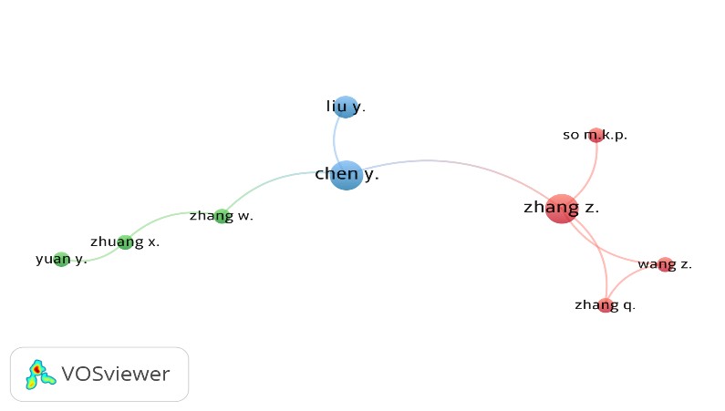 La red revela la existencia de nueve autores claves y nueve enlaces, que se congregan en tres clústeres (Figura 2), clasificación que se estableció a partir del criterio de un mínimo de dos documentos y dos citaciones por autor. La red no presenta relaciones dispersas, lo que permite identificar trabajo mancomunado entre investigadores, donde Zhang Z de la Universidad de Finanzas y Economía de Zhejiang, y Chen Y, de Universidad de California Irvine, Estados Unidos, corresponden a los autores con mayores publicaciones y conexiones.