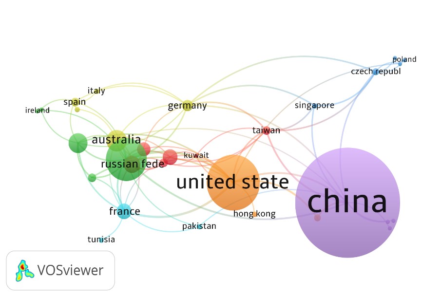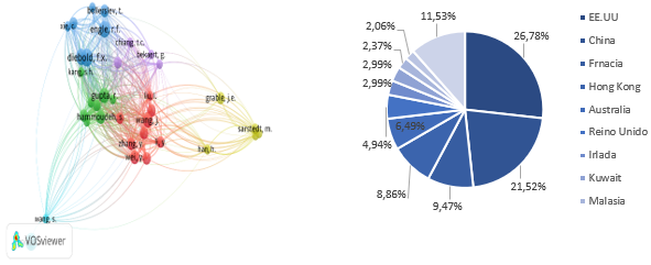 Los países líderes en la producción de conocimiento con redes de colaboración en la temática planteada han sido principalmente China, Estados Unidos, Australia y Reino Unido, con una contribución respecto al total de documentos publicados en el mundo del 55,4%. Las regiones descritas han aportado en promedio un 14,5% con trabajos individuales y 12% en ejercicios participativos con varios países (Tabla 2), resaltando, al igual que con los autores, la labor colaborativa en red; situación que no es sorprendente en el hecho de que en dos de las regiones mencionadas se encuentran las bolsas de valores más importantes en el mundo como son Shanghái, Hong Kong y Wall Street, cuyas dinámicas tiene influencia en el accionar de varias economías emergentes (Huertas, 2016; Quiroga y Villalobos, 2015 ).