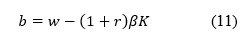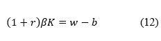Se reemplaza este valor en la restricción presupuestaria y se despeja K para calcular el valor del capital deseado para el microempresario, como se muestra en Ecuación 11, llegando a la Ecuación 12, donde se muestra la relación capital fijo, tasa de interés y salario.