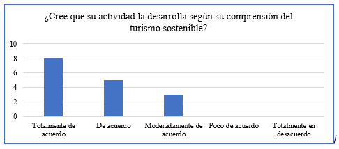 A pesar de que los hallazgos implican que los empresarios conocen el tema de estudio, se indagó en ellos la forma en la que entienden el turismo sostenible mediante una pregunta abierta, para no sesgar ni afectar su respuesta y determinar si interpretan el turismo sostenible de manera asertiva, además como actúan conforme a su concepción.