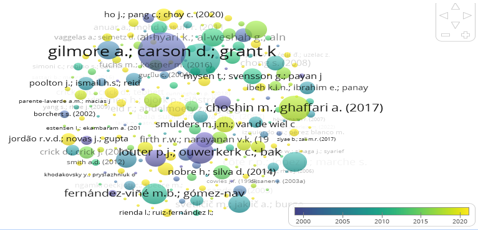Se observa que los autores que más han estudiado este tema son: Gilmore, A., Carson, D., Grant, K., (2001), Choshin, M., Ghaffari, A., (2017) y Outer, P.J., Ouwerkerk, C. y Bakker, B.A., (2015). Finalmente, se hizo en la Figura 3 el análisis de co-ocurrencia de países, así: