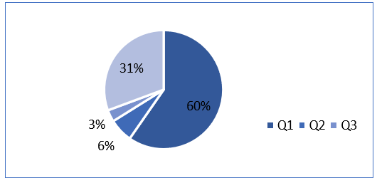 Finalmente, el 3% de las revistas analizadas se clasifican como Q3, a pesar de que las revistas Q3 suelen tener un impacto menor en comparación con Q1 y Q2, pueden representar una gama más amplia de áreas de investigación o campos menos especializados (Figura 3).