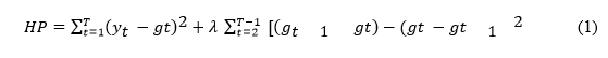 With respect to all values of gt, observations are available from time t=1, 2,...T and with λ (lambda) being a parameter taking values of 100 for annual frequency data and 1,600 for quarterly frequency data. Note that since yt is measured in logarithms, the magnitudes gt+1, -gt and gt - gt-1, are approximately the percentage growth rates of the trend value of real GDP in periods t+1 and t, respectively. The bracketed term in Equation 1 measures the change in the estimated trend rate of growth from one period to the next. The term yt - gt of the same equation measures the cyclical component ct of the natural logarithm of GDP for period t.