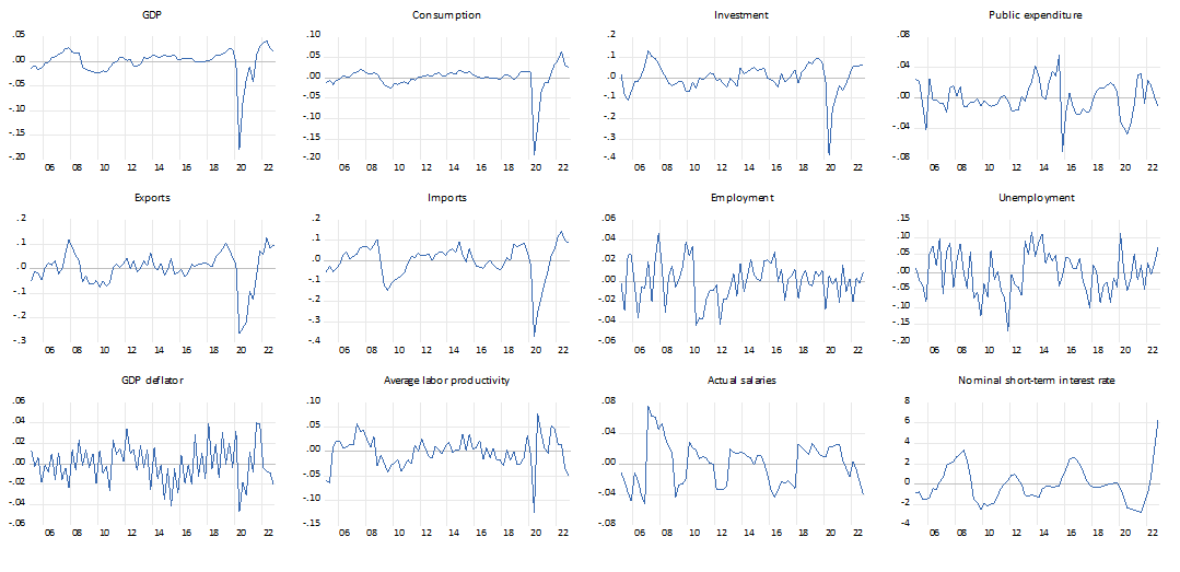 Taking seasonally adjusted quarterly time series corresponding to the period 2005:1 - 2022:4, the length of the cycle is reduced to 21.7 quarters (5.4 years), the length of the expansionary phase (14.7 quarters on average) is much longer than the contractionary phase (7.0 quarters on average). For example, the contraction of economic activity in the period 2020:1 to 2021:3 as a result of the COVID-19 pandemic is evident, with an output reduction of 7.0% (Table 2).
