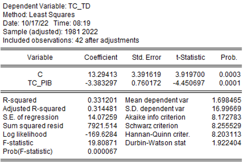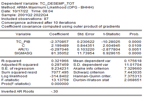 Where: ∆Ut = Change in real unemployment; β0 = constant indicating the rate of change in long-term unemployment due to structural factors (demographic, institutional, technological, among others); β1 = parameter relating changes in unemployment to changes in output, reflecting the dynamic relationship between changes in unemployment and long-term economic growth; Yt = real GDP; ℇt = disturbance term. The estimation of the model corresponds to Equation 3, with its detail in Annex 1.