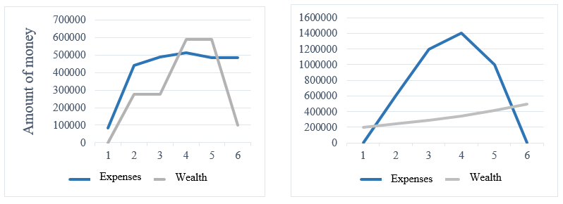 To process the information, a descriptive analysis exercise was carried out, which was focused on the variable income, expenditure and marginal propensity to consume for the entire sample, and filtered by characteristics such as gender and age ranges. Subsequently, these results were compared with the patterns observed for the case of two versions of the life cycle model, whose approximate visualization can be described as shown in Figure 1.