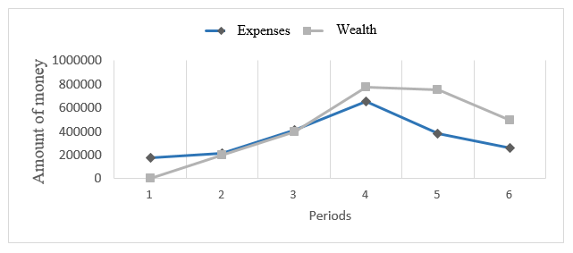 Thus, the information shown in Figure 3 reveals that consumption depends on current income, since the highest expenditure averages were recorded in periods 3 - 4 and the lowest one in periods 5 – 6, and that age has an impact on consumption/saving patterns, because there is a difference in the response by periods for each age group. Likewise, atypical patterns are observed, such as increases in the volume of expenditure in period 2 with respect to period 1, despite the condition of loss of purchasing power that was introduced as a contingency in that period. This change may be due to the increase in the amount of goods available, a fact that suggests an eventual reduction in willpower, as predicted by behavioral theory.
