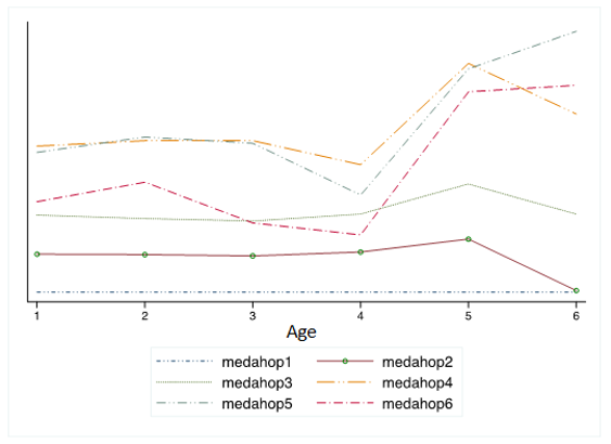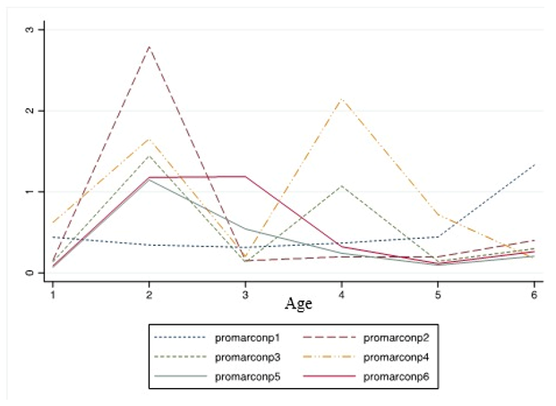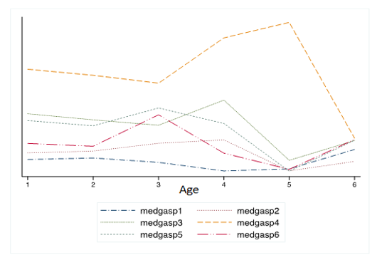 Figure 3 shows the results of expenditure levels for each of the age groups in the six periods considered. The age groupings were as follows: 1 (18 to 25 years old), 2 (26 to 35 years old), 3 (36 to 45 years old), 4 (46 to 55 years old), 5 (56 to 65 years old), and 6 (over 66). The variables presented correspond in their order to the average expenditure for each of the periods, so the variable ‘medgasp’ is the average expenditure followed by the period number.