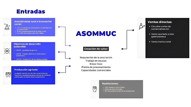 El presente trabajo muestra los resultados de un trabajo de innovación social a través de la metodología de innovación social del PCIS: alistar, entender-analizar, crear, implementar, empaquetar y escalar; donde se encuentran los conceptos de cocreación, el aprovechamiento de la producción rural, el particular contexto de unas vías de acceso deficientes y un nuevo corredor gastronómico que le permitan a la asociación las ventas directas de sus productos. El acompañamiento y movilización de ASOMMUC en este proyecto demuestra el valor de las asociadas con un acervo de más de quince años de trabajocon productos ya consolidados, pero sin los canales de venta directa. La base de estos resultados son la revitalización de la asamblea y la vinculación de nuevas asociadas.