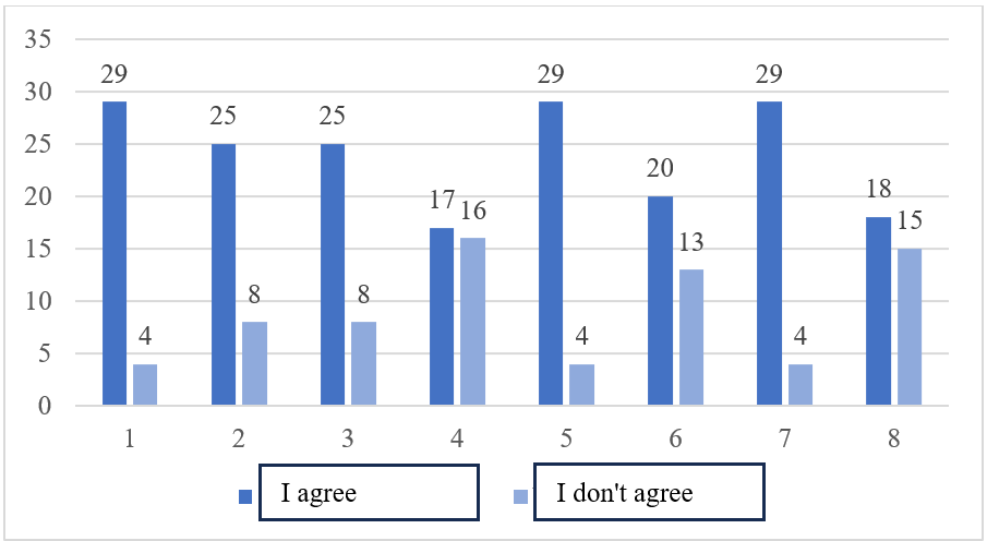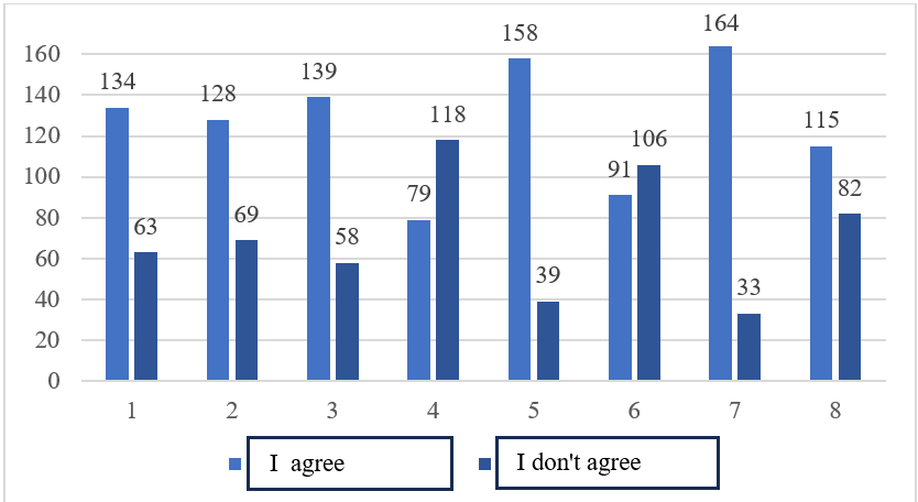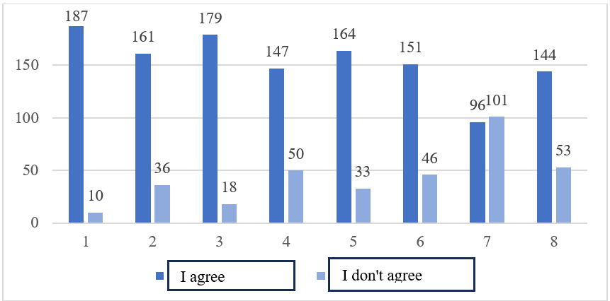 Of the 197 respondents, 29 demonstrated an adequate understanding of the concept of nudge. When asked for a definition, these participants mentioned the word nudge or expressed ideas close to the definition, such as the use of positive reinforcement and indirect suggestions to induce group decisions and actions. It focuses on small actions with the potential to modify both individual and collective behavior, with the goal of improving decision making by changing people's environment. In short, it is a way to influence decisions and behaviors at both the individual and group levels. The next section of the survey addresses the opinion on the above-mentioned nudges, without respondents being certain whether they are deliberate or not.