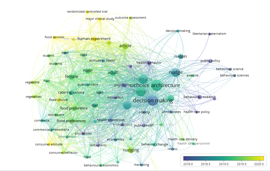 Secondly, according to the figures generated with the VOS viewer software, it is presented that nudge research, in its American origin, has had acceptance and discussions in European countries, involving that it is an area that generates a large amount and a tool that is being discussed in a top-level academic context. On the other hand, with regard to the Latin American area, there is no evidence of research about the nudges, it happens because it has not been of interest and lack of knowledge of current discussions like the nudges. Also, that the programs of Humanities in the local context have dedicated to continue with purely theoretical discussions and the proposal of these Anglo-Saxon economists and philosophers is to sort out real problems which based on theories are possible to take to the practice and research helped by the statistics.