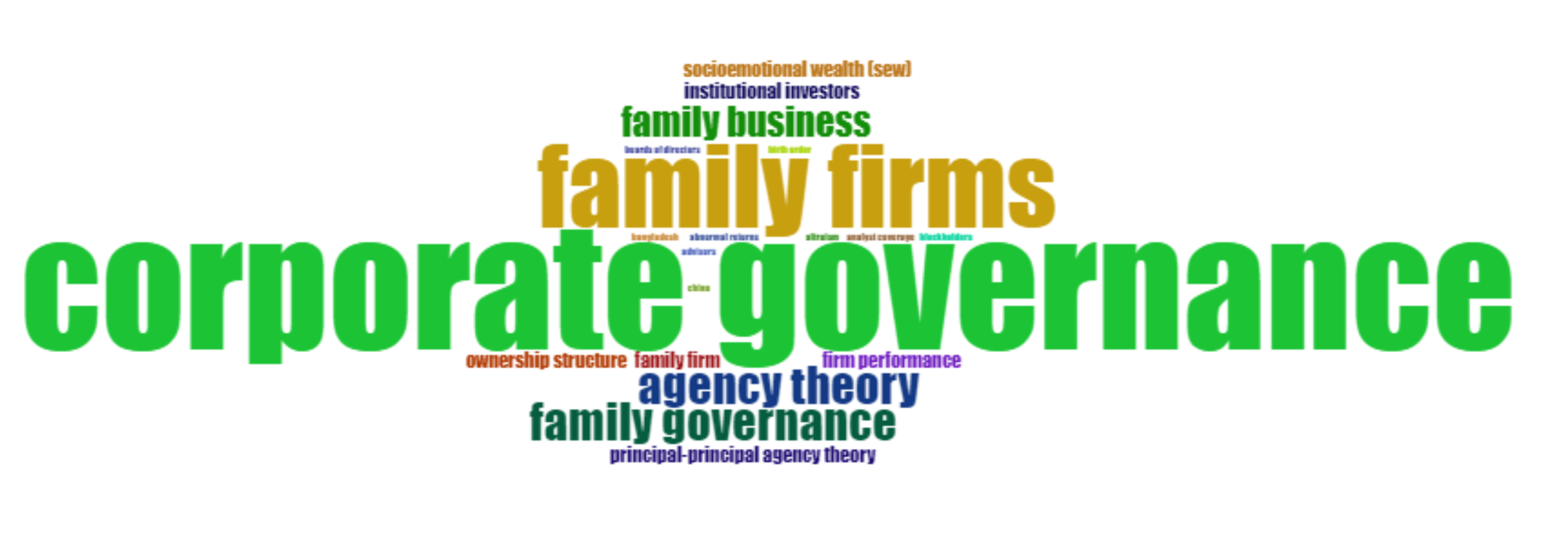 Figure 4 displays the significance of the top 10 keywords within the reviewed dataset. It highlights keywords such as corporate governance, family firms, family business, and family governance