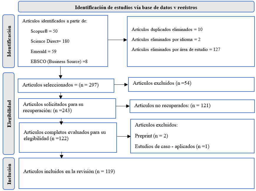 La búsqueda inicialmente fue en la base de datos Scopus, encontrándose 50 artículos registrados, seguidamente en Science Direct, identificando 180 artículos registrados, la siguiente consulta fue Emerald con 59 artículos y por último EBSCO con 8 artículos, eligiendo finalmente 119 para la revisión final, tal como se muestra en la Tabla 1. En un primer momento, se descargaron las bases de datos a Excel, donde fueron revisados por títulos y abstract, mediante el cual se descartaron artículos que estaban duplicados, que no correspondían al área de estudio, y que no abonaban a la búsqueda. Posteriormente, se realizó el análisis de los datos en Atlas Ti. V24, donde se utilizaron los siguientes códigos: CO, RL, impacto, y discusión, los cuales se extrajeron vía informes en Word, para dar respuesta a las interrogantes aquí planteadas.